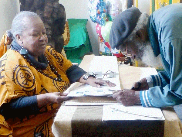 “Bunny” Rodrigues and her husband Andrew Rodrigues work together on a burlap sign that will hang in the new Gullah Museum. (Eileen Keithly/For South Strand News Vermelle )